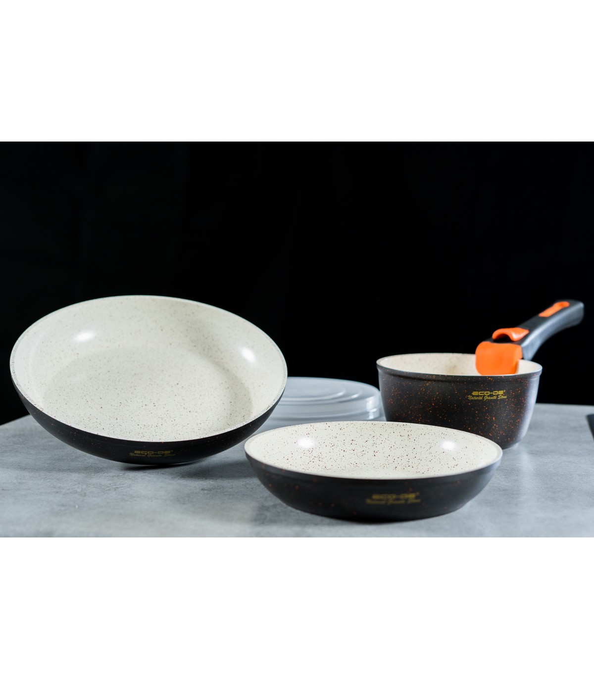 - Die ECO-DE "Granite Stone" Keramikpfannen bieten eine Hitzebeständigkeit von mehr als 240ºC. Sie verteilen die Hitze gleichmäßig und ermöglichen ein optimales Garen der Speisen. Ein weiterer Vorteil ist, dass sie perfekt auf Glaskeramik-, Induktions- und Gaskochfeldern funktionieren.