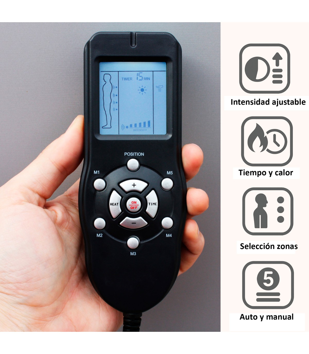 Colchón dotado de vibromotores ondulantes de alta tecnología para masaje de cuello, zona lumbar, dorsal y piernas.