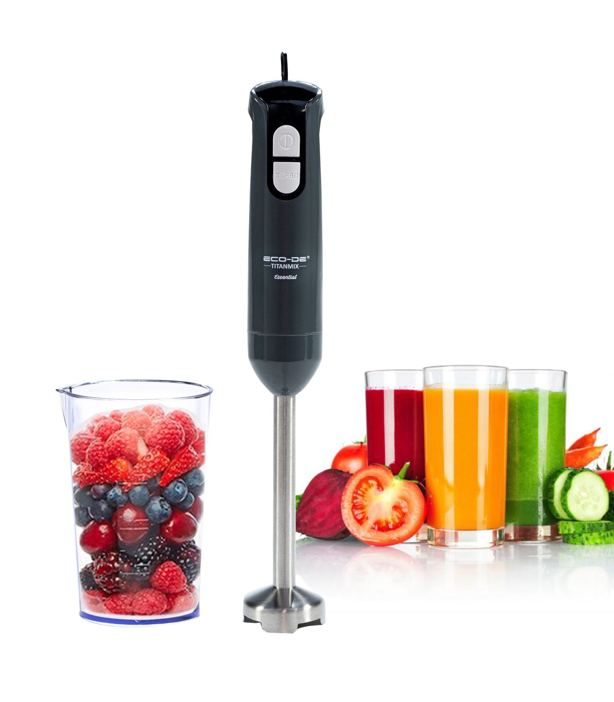 Batidora de mano Titanmix Essencial ECO-DE® le permitirá triturar, batir, emulsionar y picar todo tipo de alimentos gracias a sus dos grandes cuchillas de titanio con doble filo. Este diseño permite obtener velocidades de hasta 14.000 Rpm.