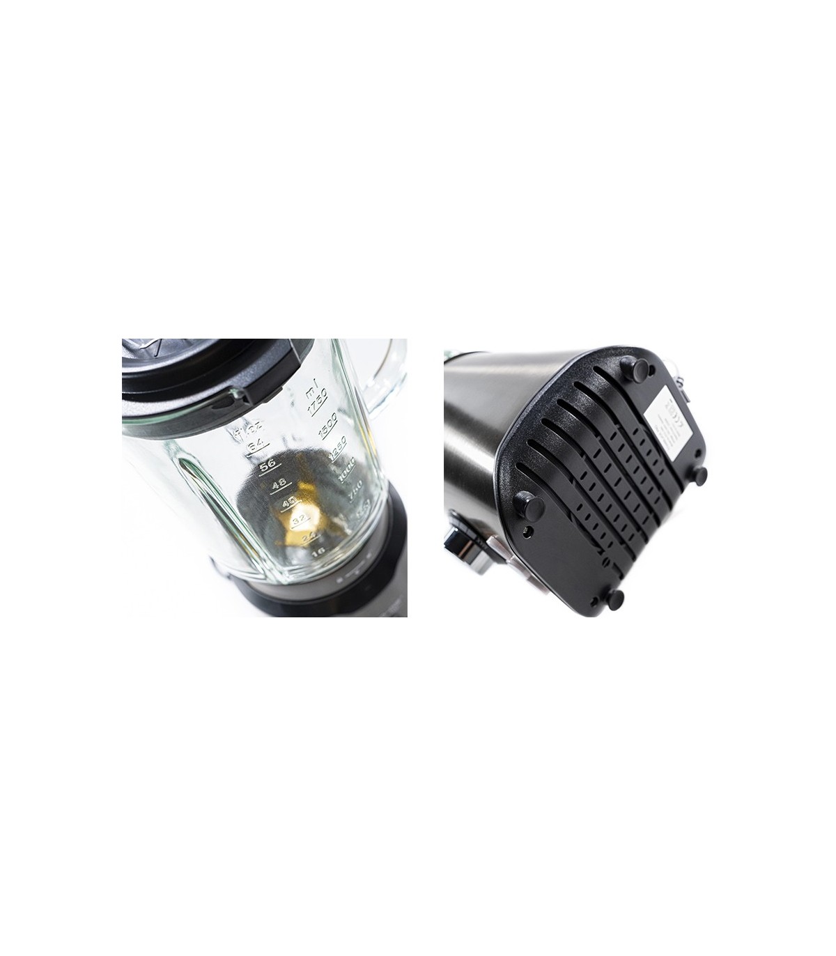 ECODE DESIGN: Chrome Chrome Bronze Stainless Steel Finish, Red keypad contour LED. And Triple Botonera Bottom with Red Led outline. 100% Spanish design. Thermosecur Crystal Jug: graduated in 1750 ml 1890 Oz. Its tempered heat-resistant glass guarantees maximum safety. Top cover with safety closure to avoid possible splashes. And 40 ml measuring cup. It serves as a top cap and allows you to introduce food even if the mixer is running