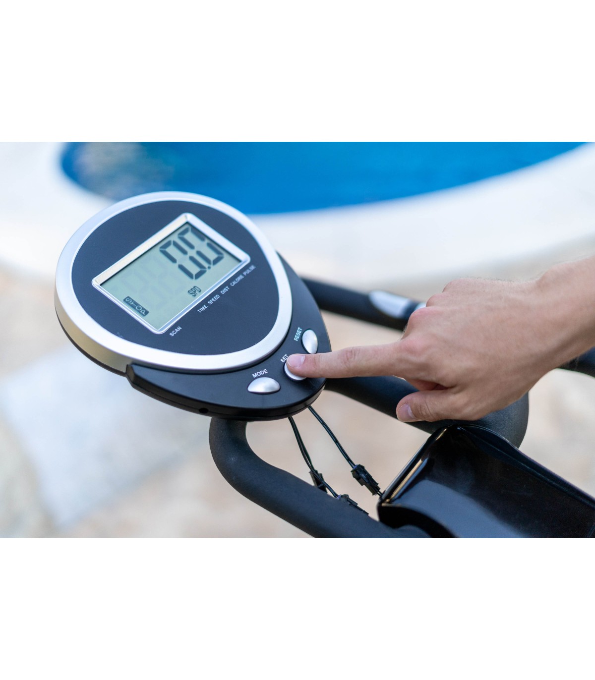 Control panel with LCD screen. Belt transmission. Competition braking system. Adjustable saddle in length and height. Fixed pinion system. VSS (Virtual System suspension) Aluminum pedals with toe caps. Support for Smartphone (mobile not included)
