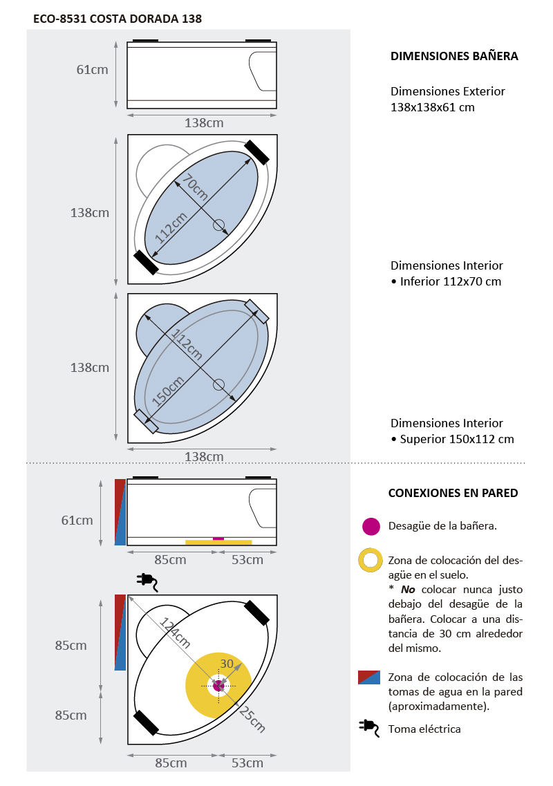 La bañera de hidromasaje ECO-DE® modelo "COSTA DORADA", cuenta con los mejores sistemas de masaje del mercado. Destacamos su forma ojo de buey que dará a su baño la iluminación necesaria para ambientar su baño en el mejor de los relax.