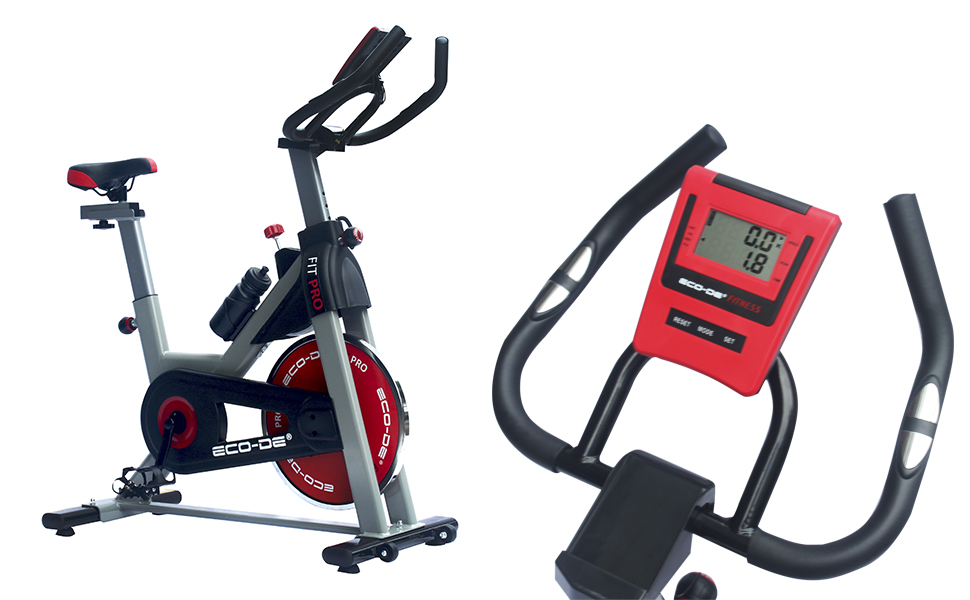 ECODE Bicicleta de Spinning. Completamente Regulable en altura. Regulación Total de Intensidad, Pantalla LCD multifunción con pulsómetro, sillín prostático, Fitness