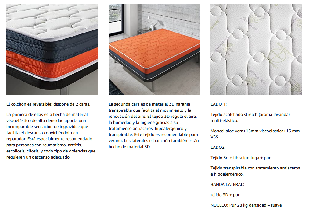 - REVERSIBLE, CARA INVIERNO/VERANO: Los colchones modelo Baicen son REVERSIBLES. La cara invierno está compuesta de espuma visco-elástica de alta densidad que ofrece un perfecto soporte de todas las partes del cuerpo y favorece la sensación de ingravidez durante el sueño. La cara verano está compuesta de un tejido 3D que mejora la transpiración del colchón evitando el exceso de calor durante la noche