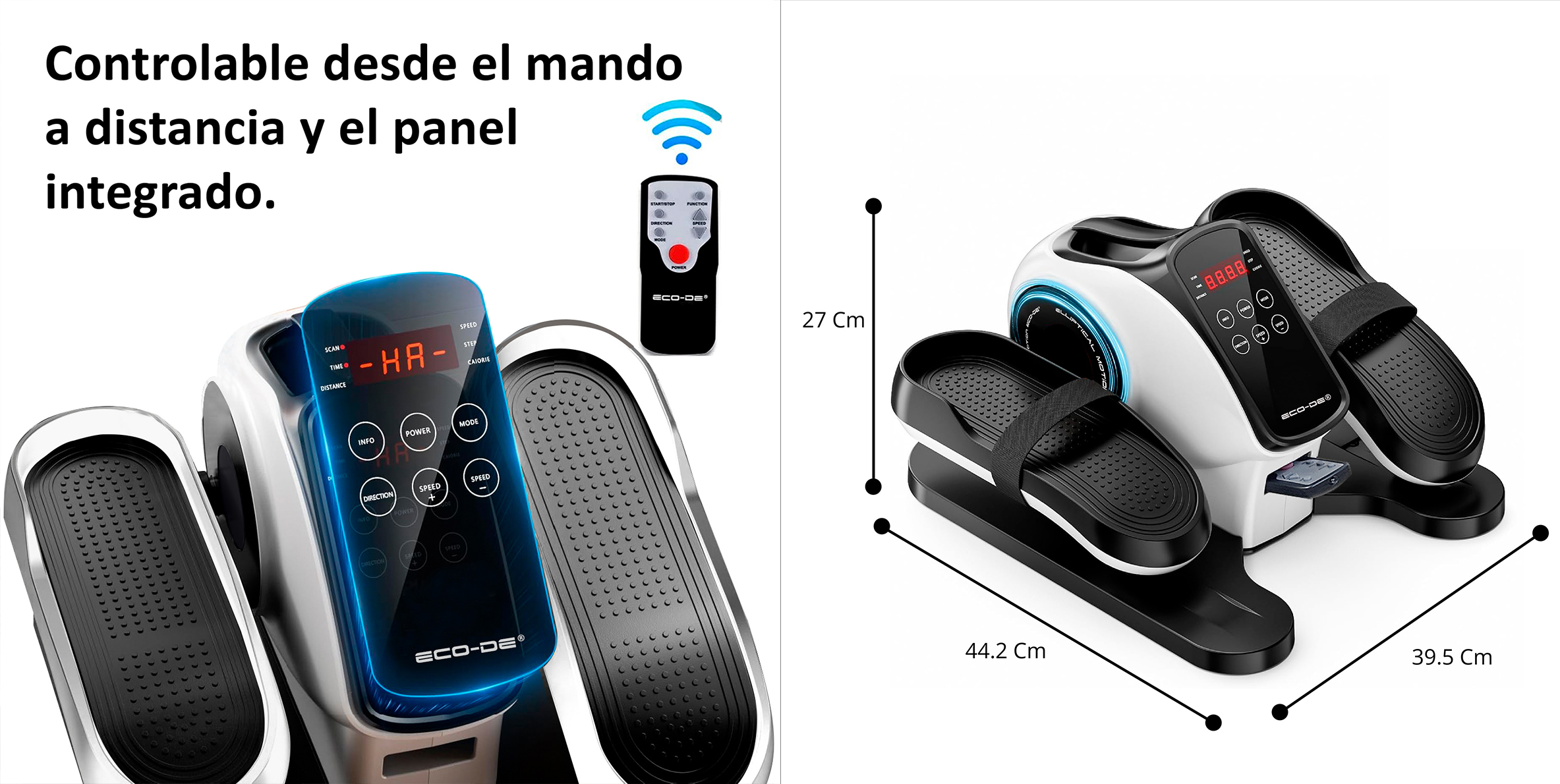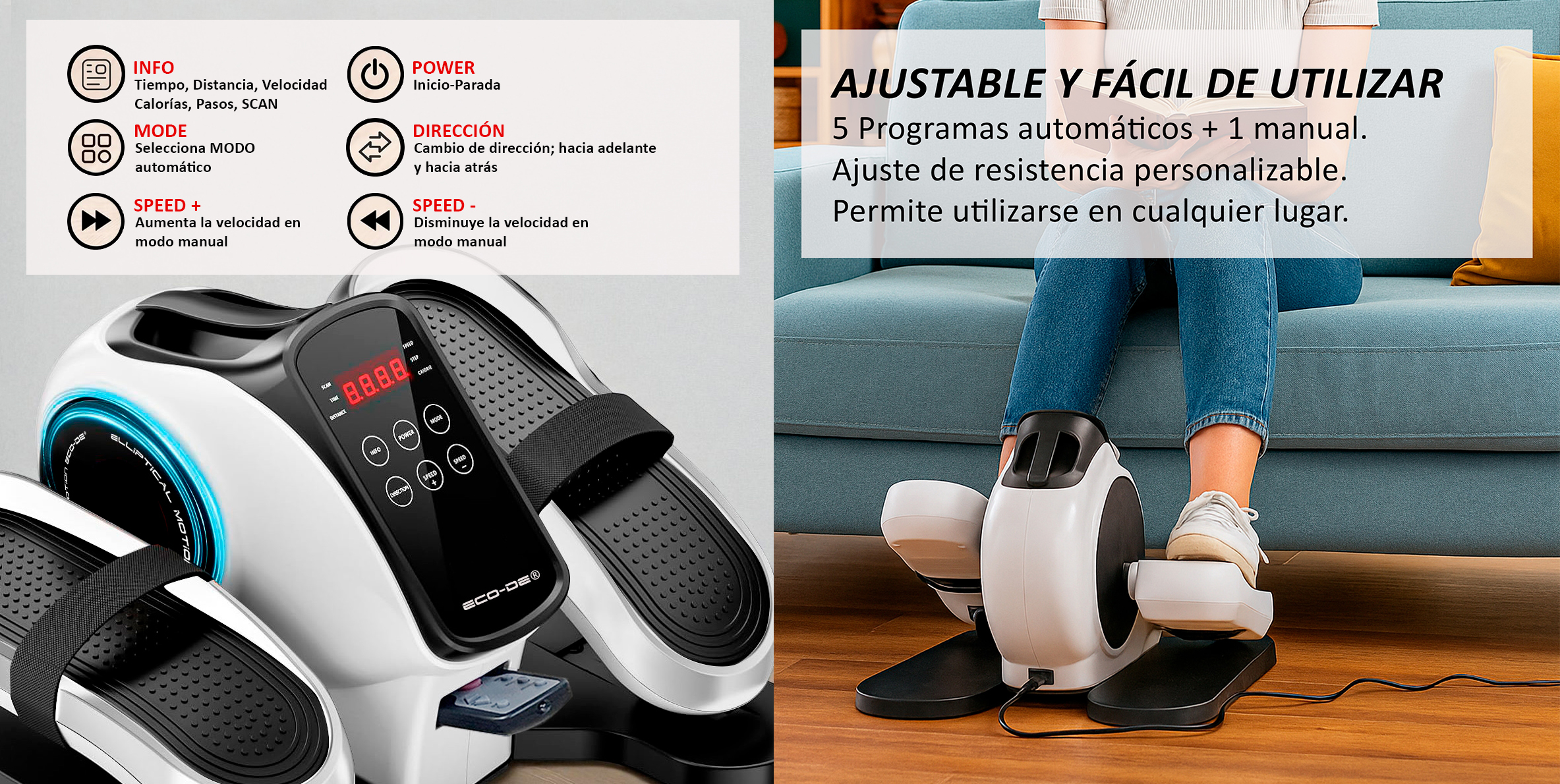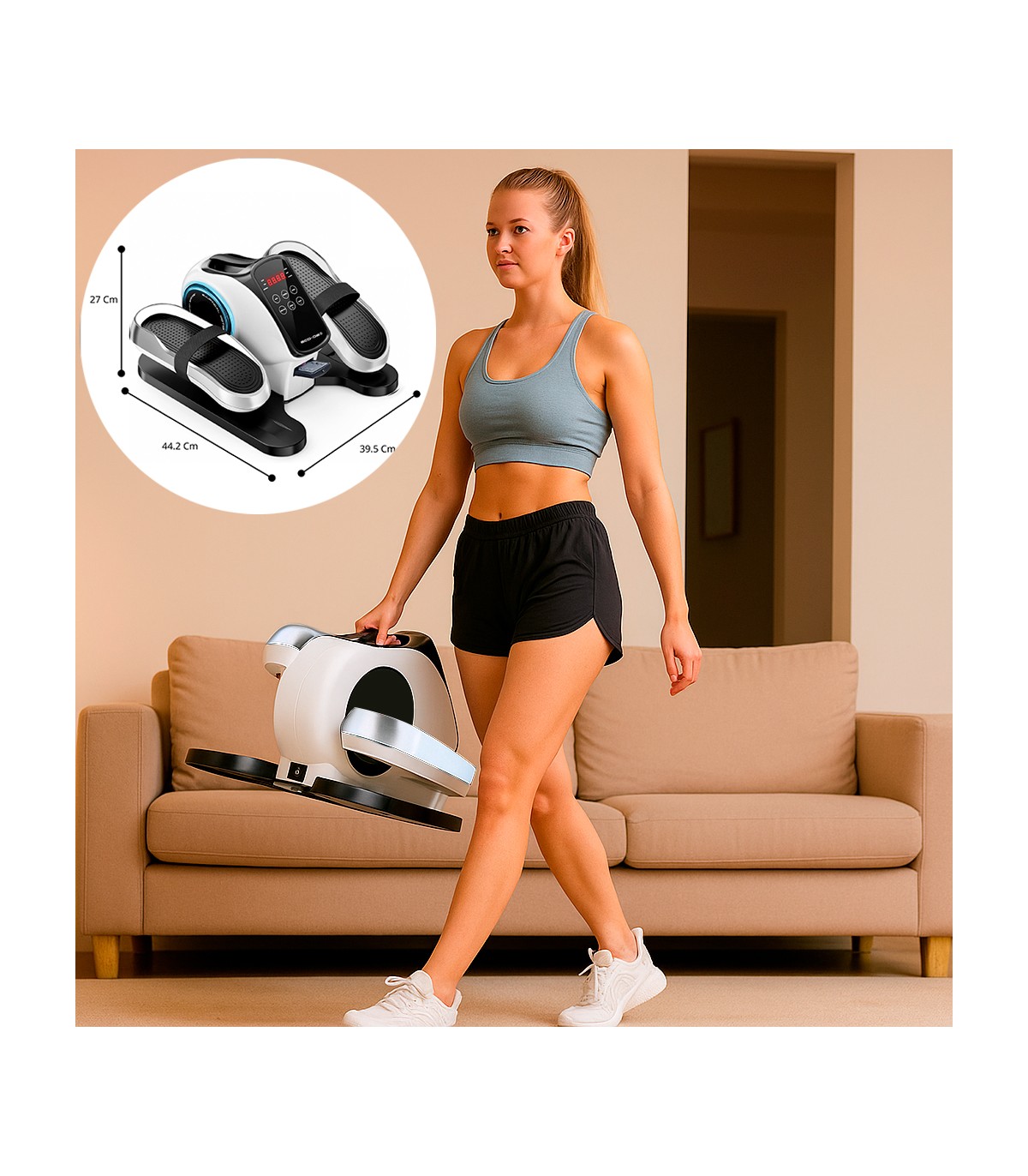 ¿Buscas una forma cómoda y práctica de mantenerte activo incluso mientras trabajas o estás sentado? La elíptica eléctrica portátil ECO-DE® es ideal para ejercitarte sin esfuerzo desde casa o la oficina. Su diseño compacto y ligero permite transportarla fácilmente y usarla en cualquier lugar. Puedes utilizarla enchufada o en modo manual, lo que la convierte en una opción versátil tanto para quienes buscan mantenerse en forma como para quienes están en procesos de rehabilitación.