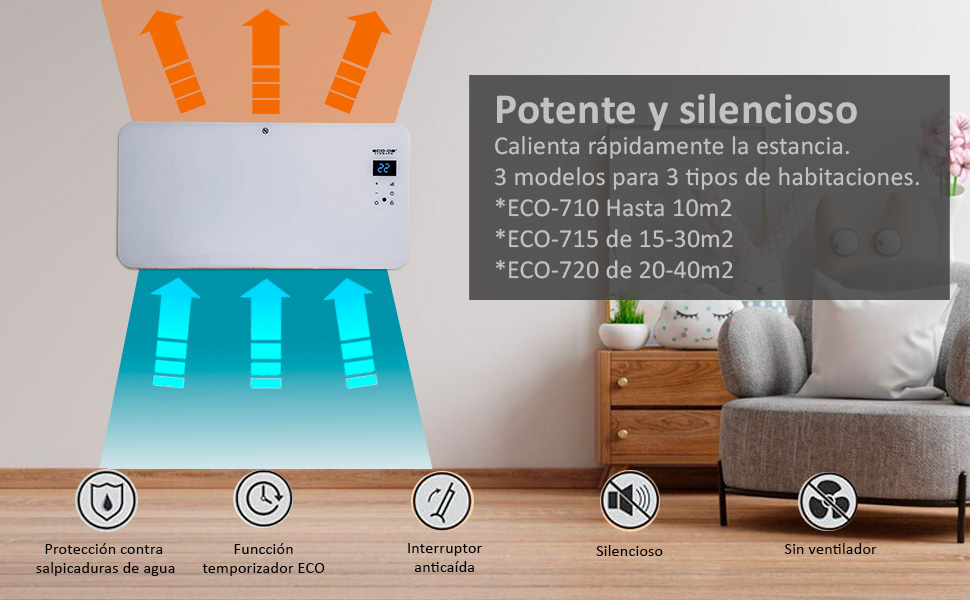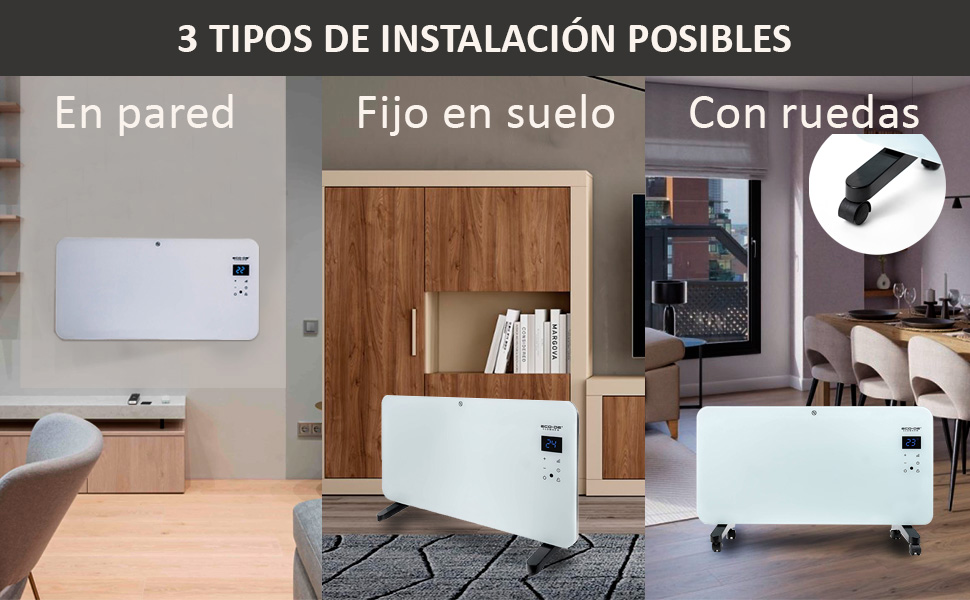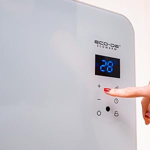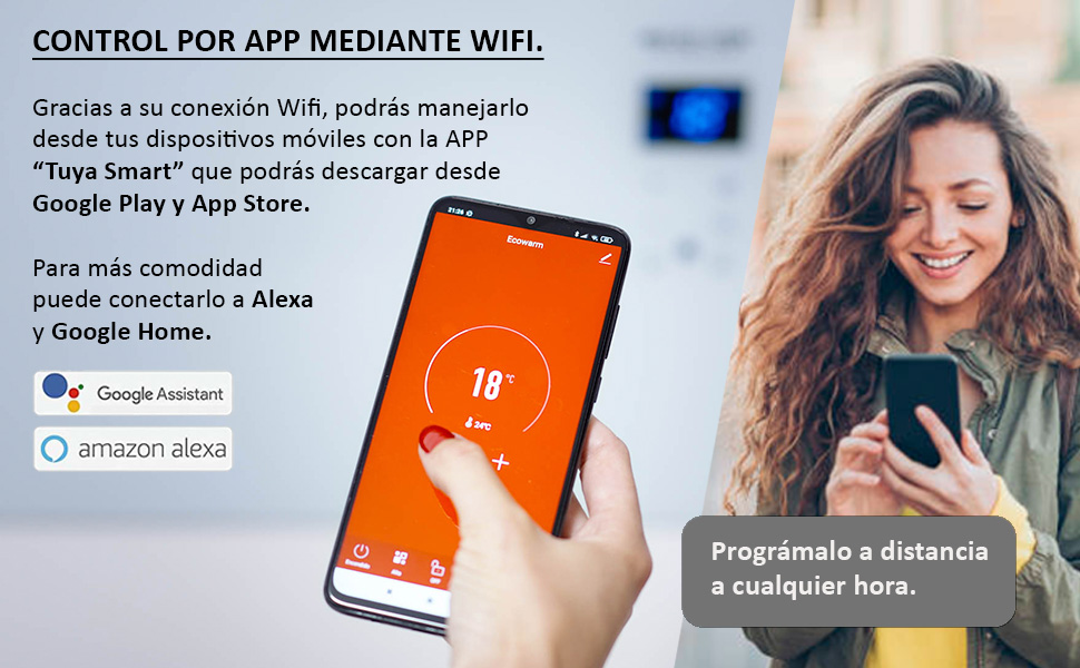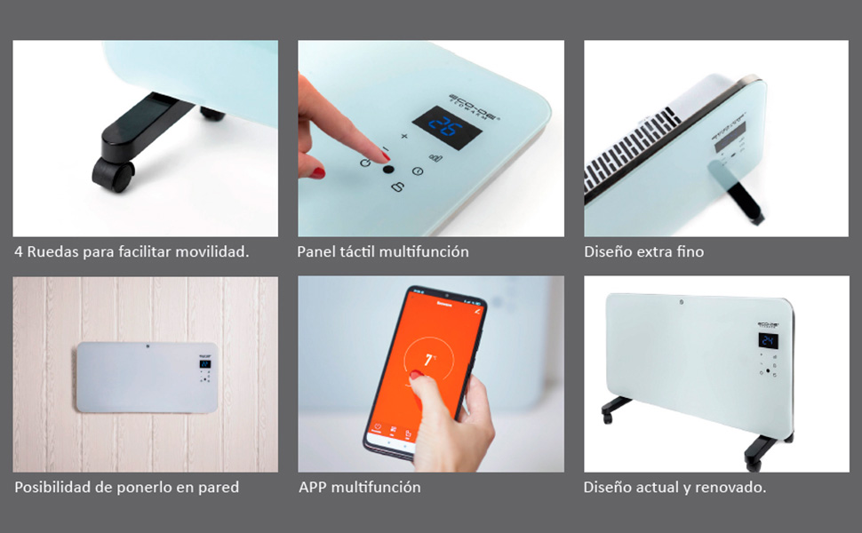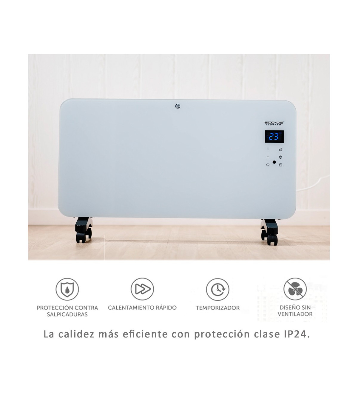 ECODE Radiador Convector de Bajo Consumo. Portátil con ruedas. Estufa Eléctrica, Silencioso, Temporizador, Control Táctil, Control por APP TUYA Móvil, Wifi, Termostato de seguridad IP24 programable, Exterior de tacto fresco, Pantalla digital, Google Home y Alexa. Apto para baños. 2 niveles de potencia. Bloqueo niños. Color blanco.