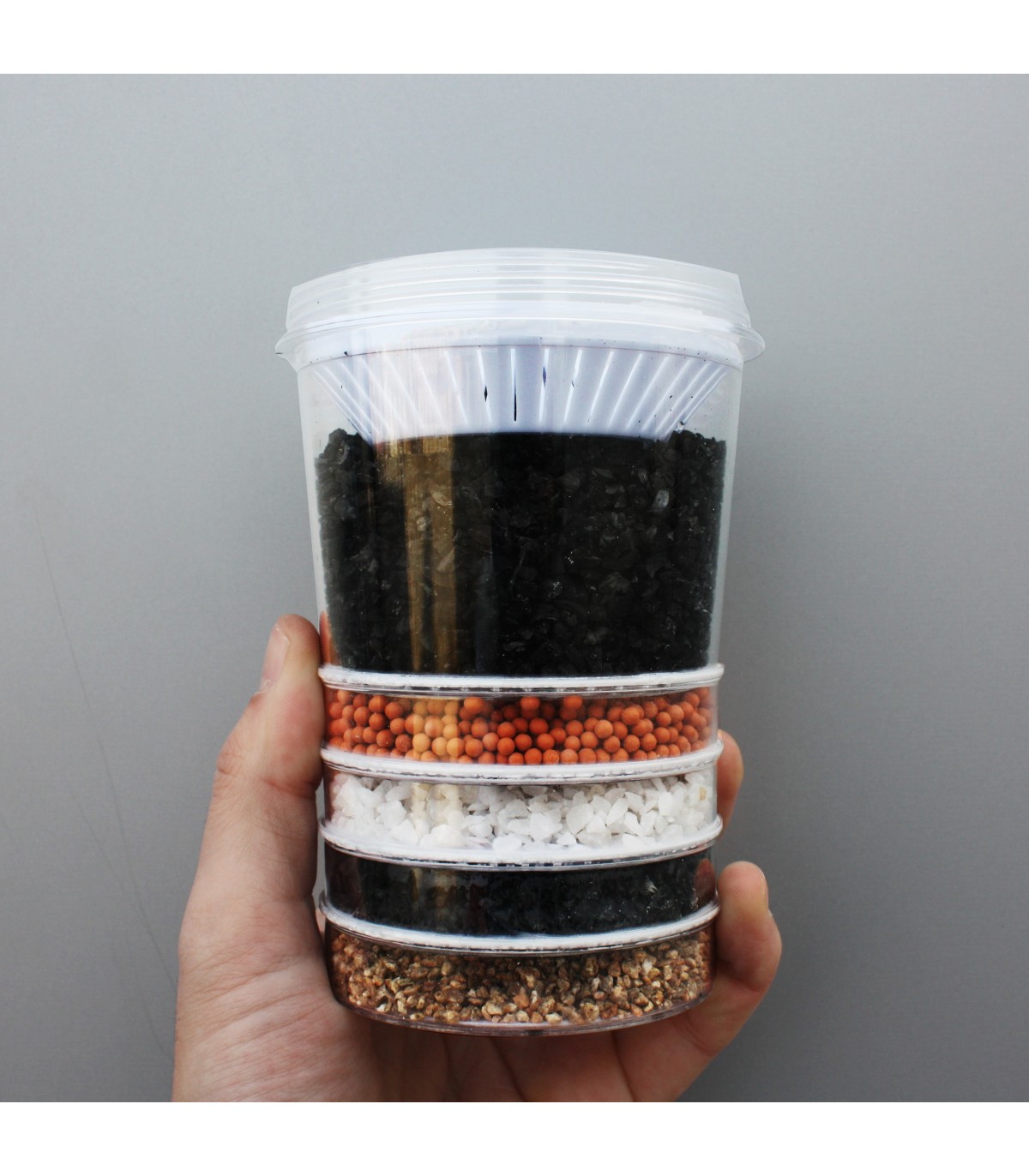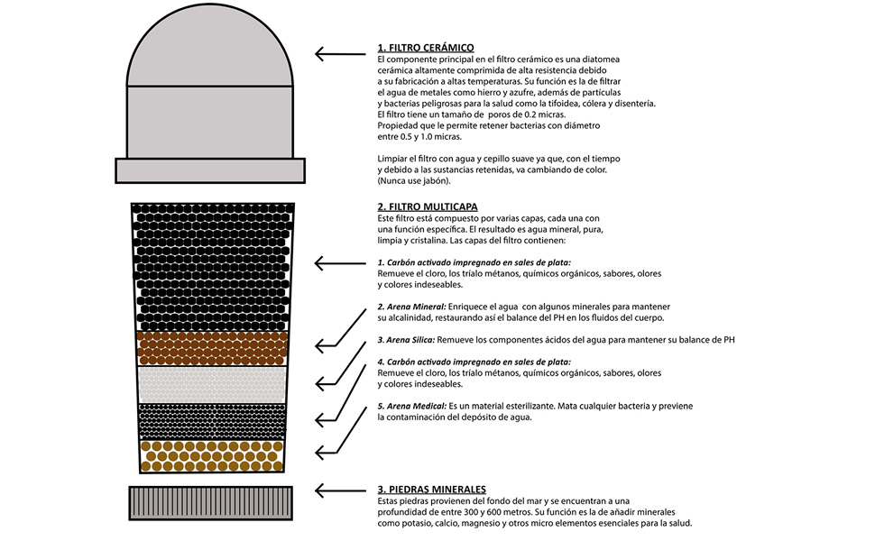 El componente principal en el filtro cerámico es una diatomea cerámica altamente comprimida de alta resistencia debido a su fabricación a altas temperaturas. Su función es la de filtrar el agua de metales como hierro y azufre, además de partículas y bacterias peligrosas para la salud como la tifoidea, cólera y disentería. El filtro tiene un tamaño de poros de 0.2 micras. Propiedad que le permite retener bacterias con diámetro entre 0.5 y 1.0 micras