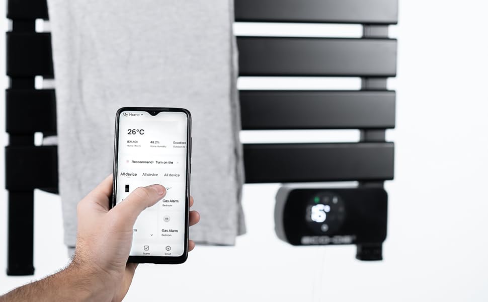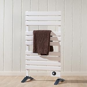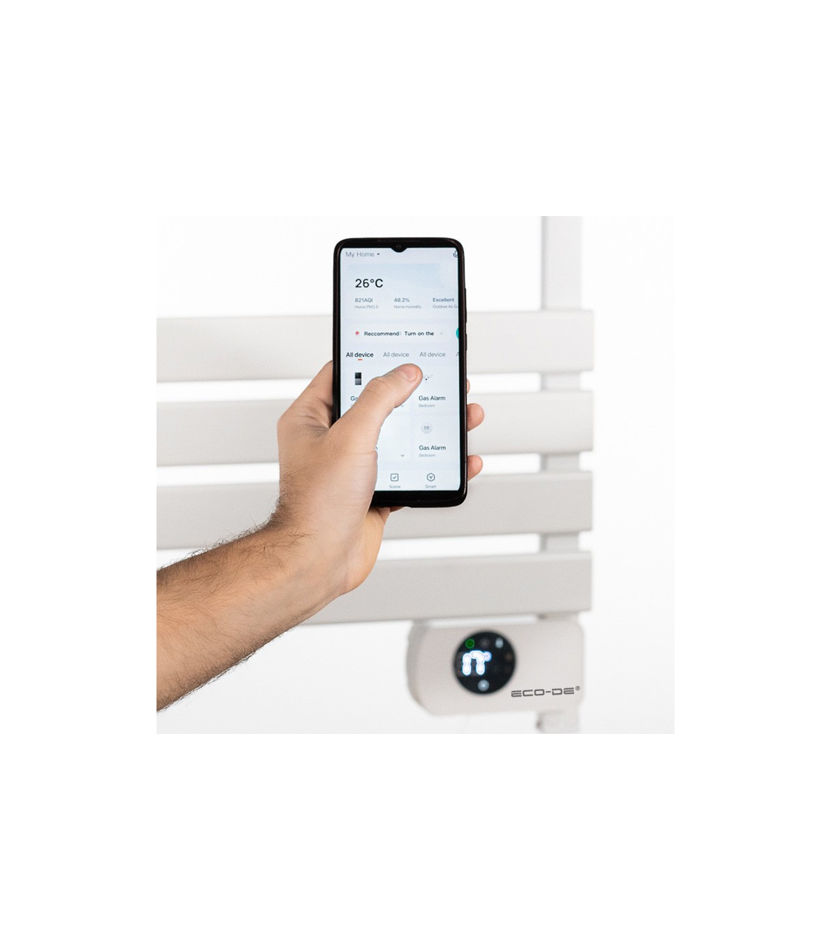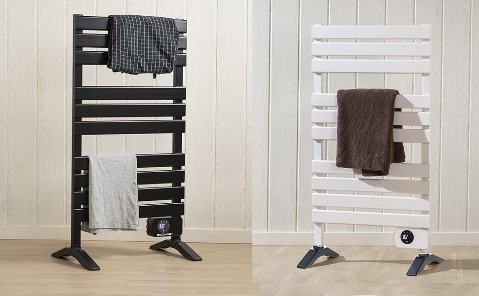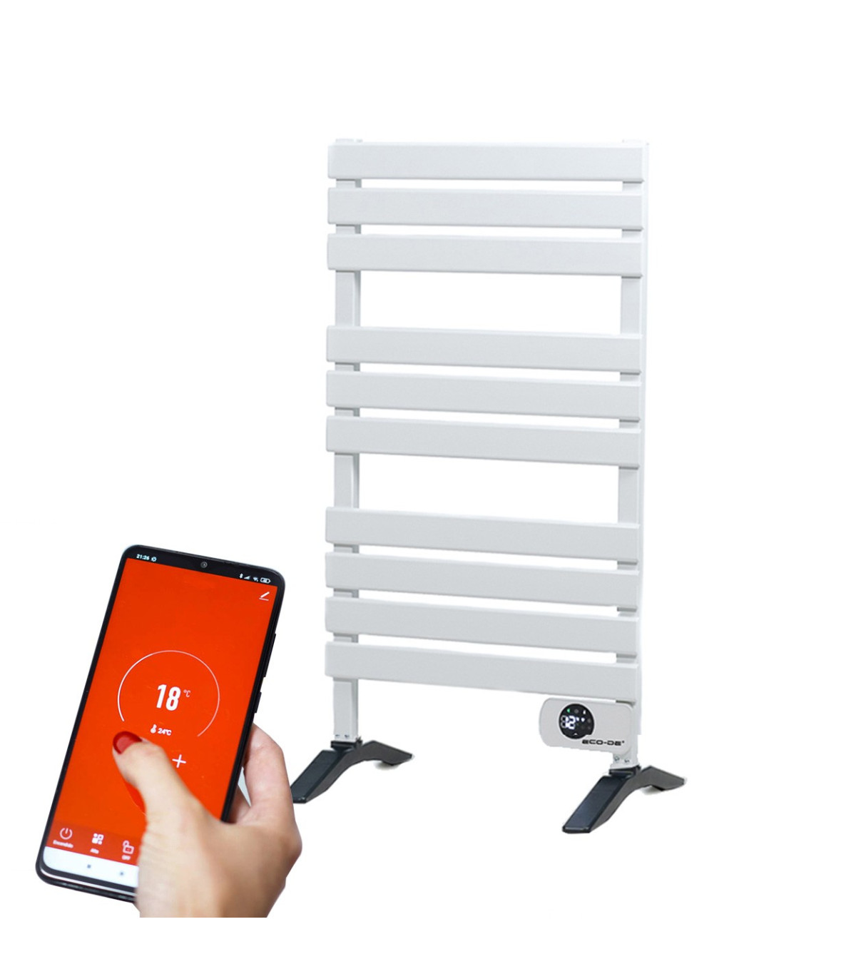 ECODE Toallero Eléctrico con patas, Programación 24/7, Radiador seca toallas, 500 W IP24, “Towel Heat”, WIFI, Control por APP Tuya, Pantalla Led, Seca Toallas, doble Kit de Instalación sobre el suelo o colgado. 105x56x2 cms. ECO-701.