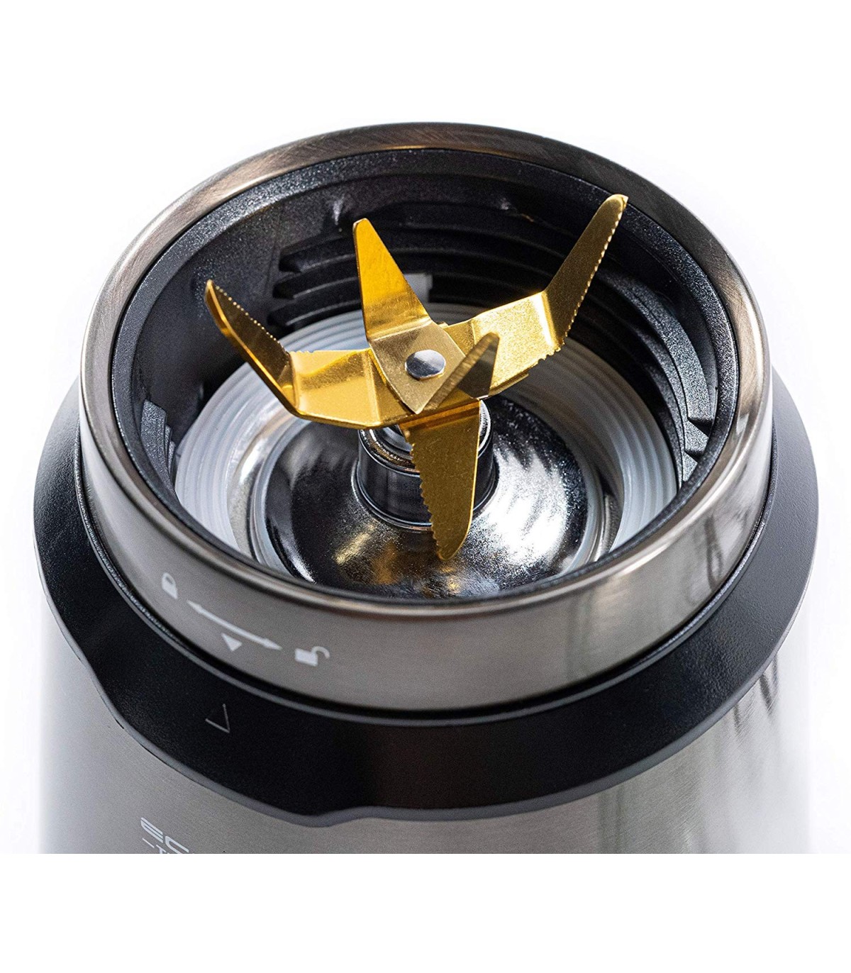 La fonction Pulse vous aidera à hacher et écraser grâce à ses 6 lames en titane aux impulsions contrôlées. De cette façon vous observerez l'évolution du résultat, vous obtiendrez des smoothies délicieux et savoureux, vous pourrez moudre du café, des noix, des légumes, voire de la glace. Lames à 6 lames avec revêtement en titane avec scie : résultats professionnels car elles génèrent un effet cyclonique. 2 lames latérales dentelées, 2 lames centrales à bord tranchant et 2 lames inférieures.