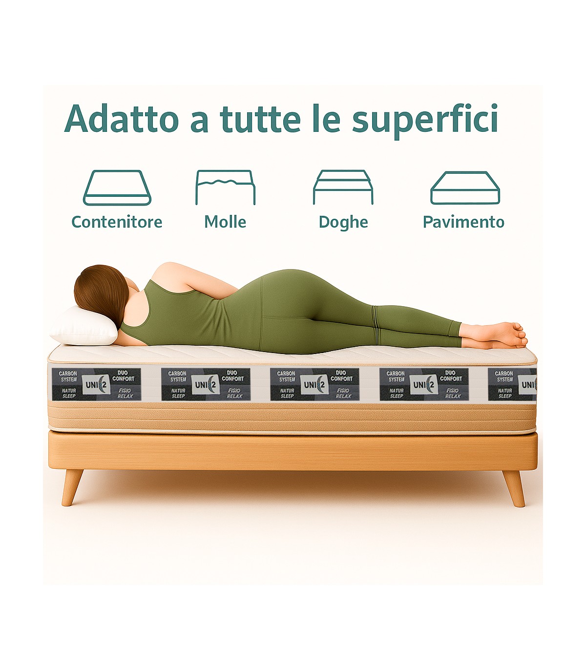 • Noyau : 22 cm d'ELIOCEL/PUR 25 kg. CÔTÉ 1 : Matelassé avec du tissu STRECH en fibre de carbone. 3 cm de viscoélastique : + 1,5 cm de ViscoGEL. + 1,5 cm de Soft S.S. CÔTÉ 2 : Matelassé avec du tissu 3D air. + Fibre ignifugée (Norme UNE 23727). HAUTEUR FINIE : 26/28 cm (+-1)