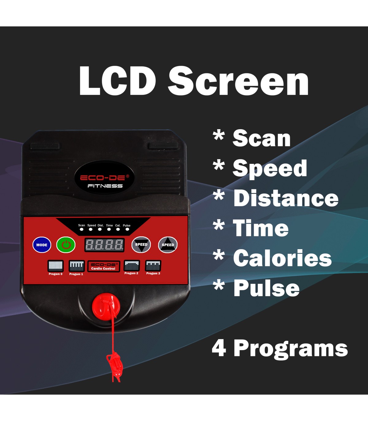 - 4 programmes ajustables Capteur cardiovasculaire. Puissance du moteur: 1000W. Écran LCD: vitesse / distance / temps / calories / scan / pulsations / programmes. Vitesse: 1KM / H - 10KM / H. Taille de la piste: 98x36 cm. Il peut être plié manuellement Clé d’arrêt d’urgence / clip de sécurité.