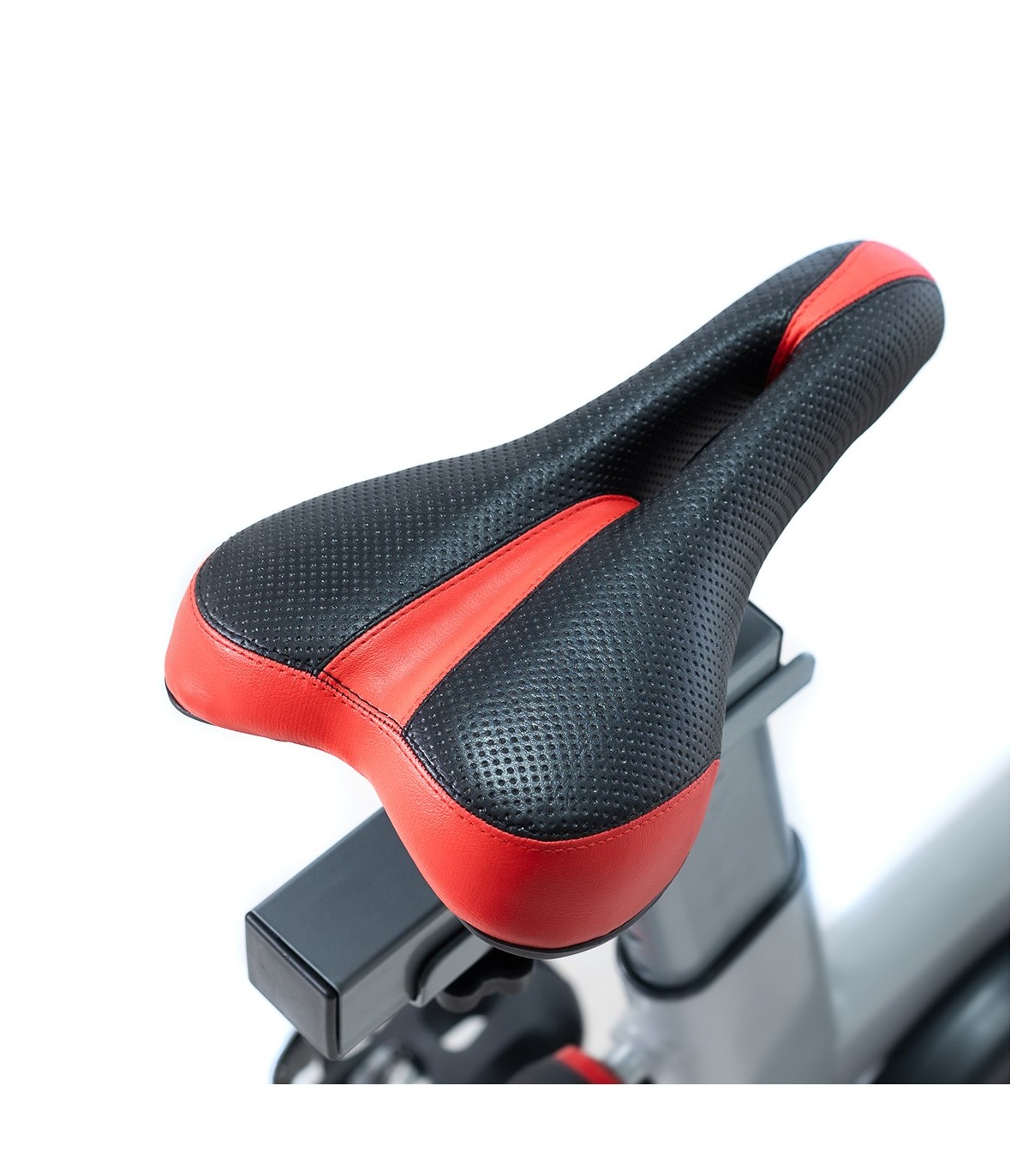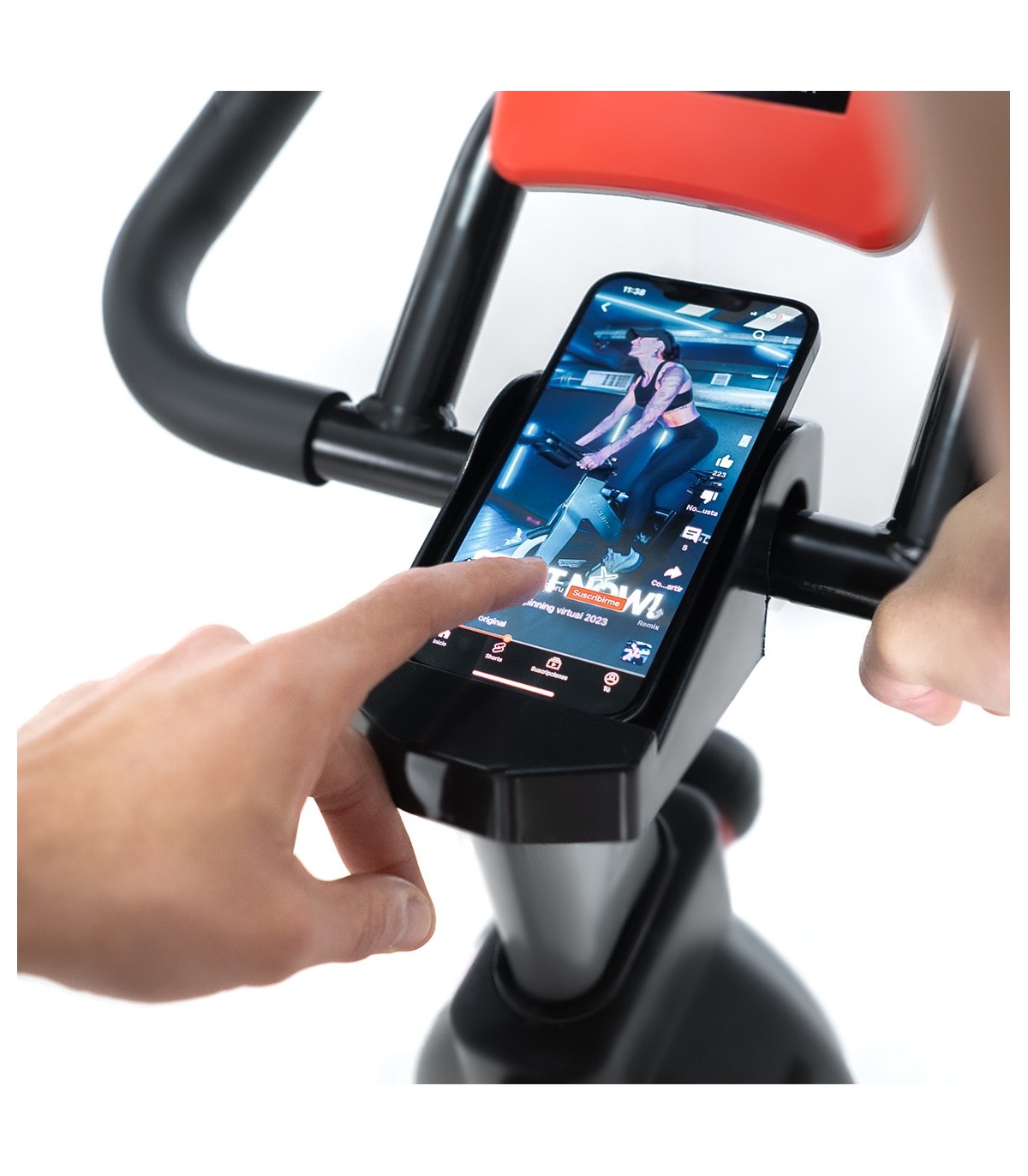 Panneau de commande avec écran LCD. Transmission par courroie. Système de freinage de compétition. Assise réglable en longueur et en hauteur. Système à engrenages fixes. Pédales en aluminium avec cale-pieds. Prise en charge des smartphones (téléphone portable non inclus)