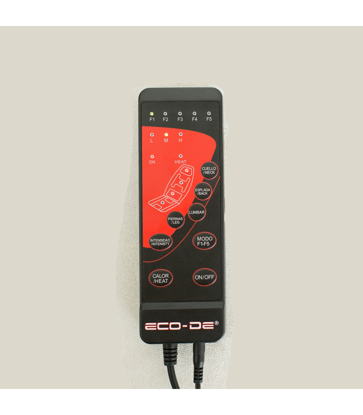 La télécommande ECO-DE vous permet de sélectionner la zone à traiter à tout moment. dos, cou, lombaire et les jambes, en plus de l'intensité du massage; bas, moyen et haut, et modes de massage, 5 au total.