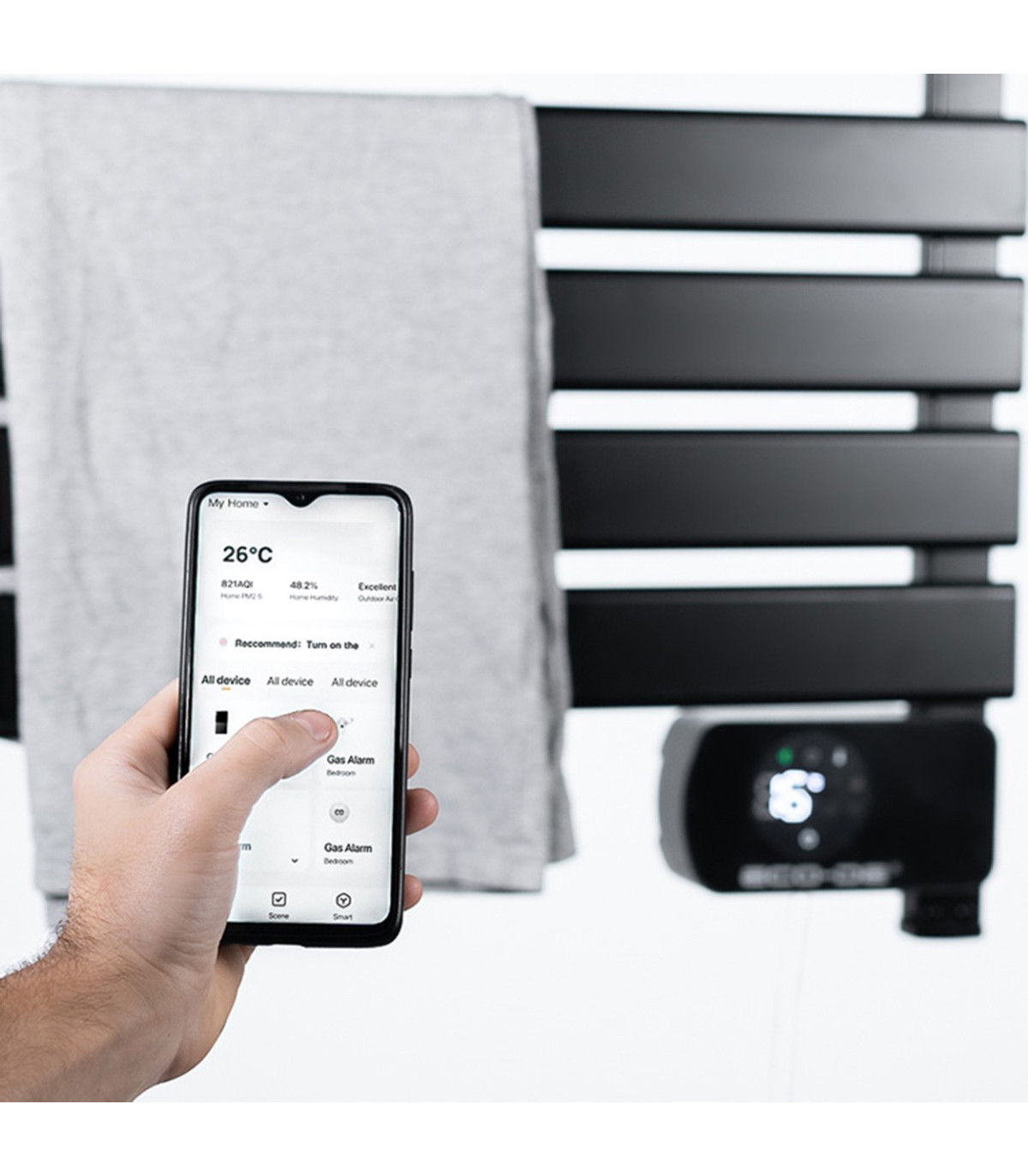 ECO-DE CHRONOTHERMOSTAT: Thanks to its Wi-Fi connection, you can program the towel warmer 24/7: On/Off, On/Off time, and desired temperature selection.