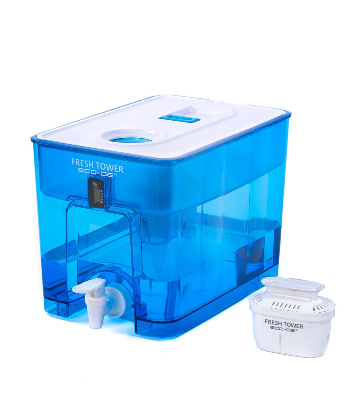 ECODE Torenwaterzuiveraar, 8 filtratiesystemen, keramisch filter, koolstof, natuurlijke stenen. Totale capaciteit 24 liter. Inclusief filter. Vermindert chloor, kalk en onzuiverheden.