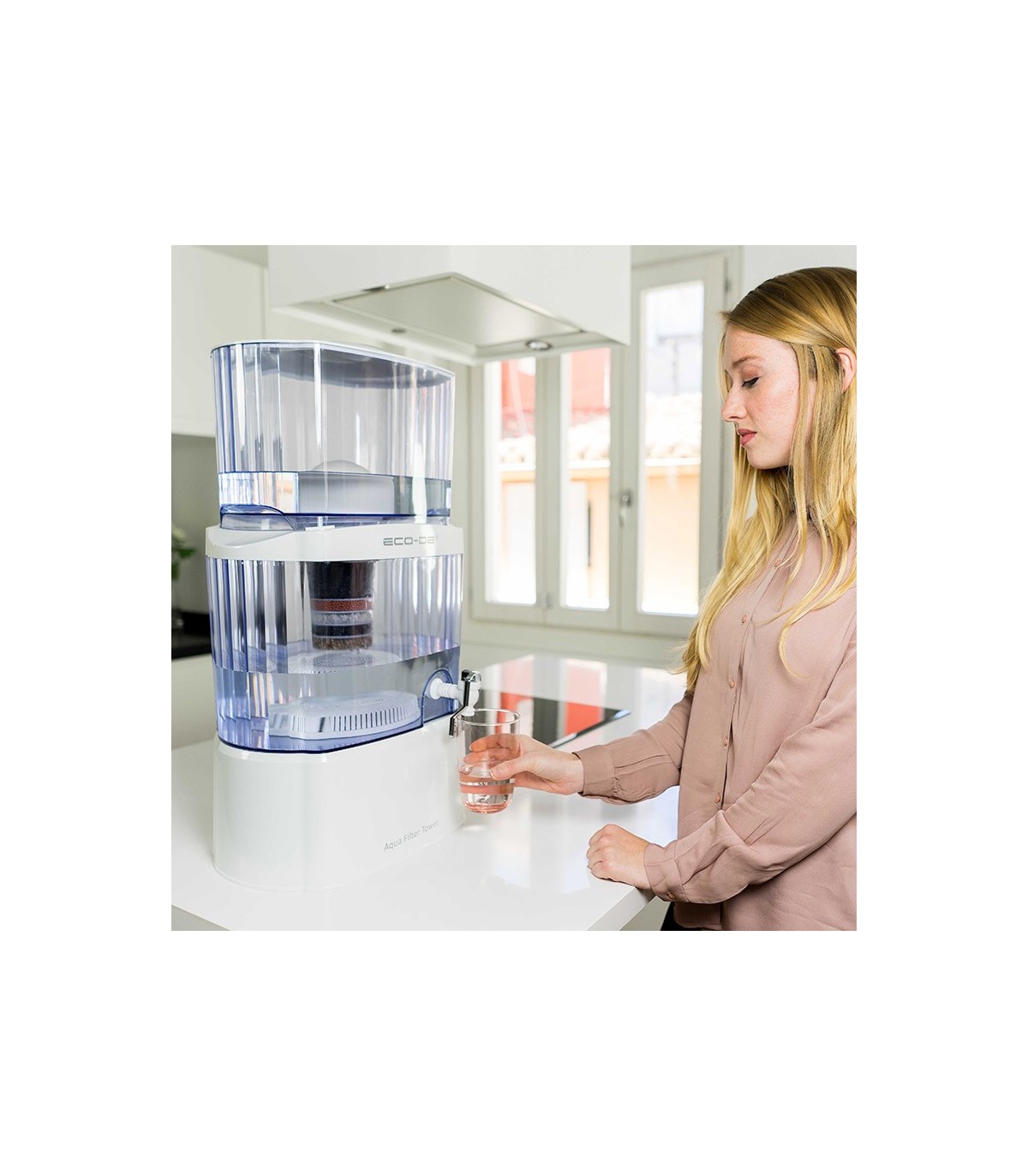ECODE Torenwaterzuiveraar, 8 filtratiesystemen, keramisch filter, koolstof, natuurlijke stenen. Totale capaciteit 24 liter. Inclusief filter. Vermindert chloor, kalk en onzuiverheden.