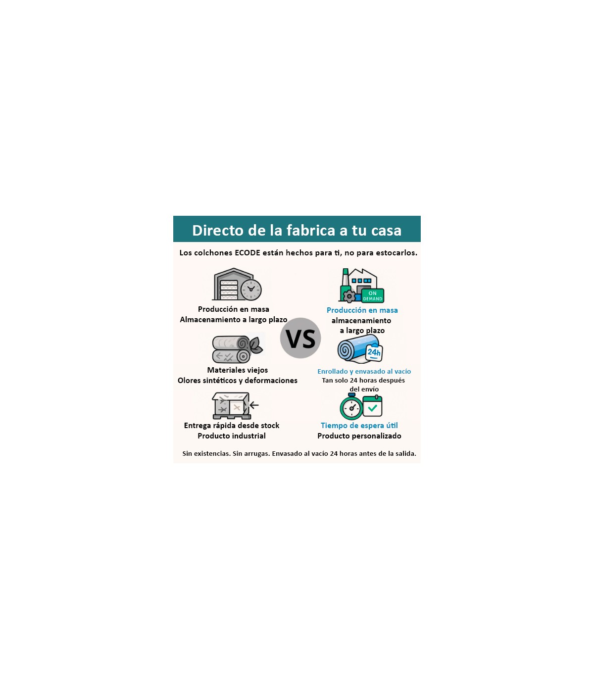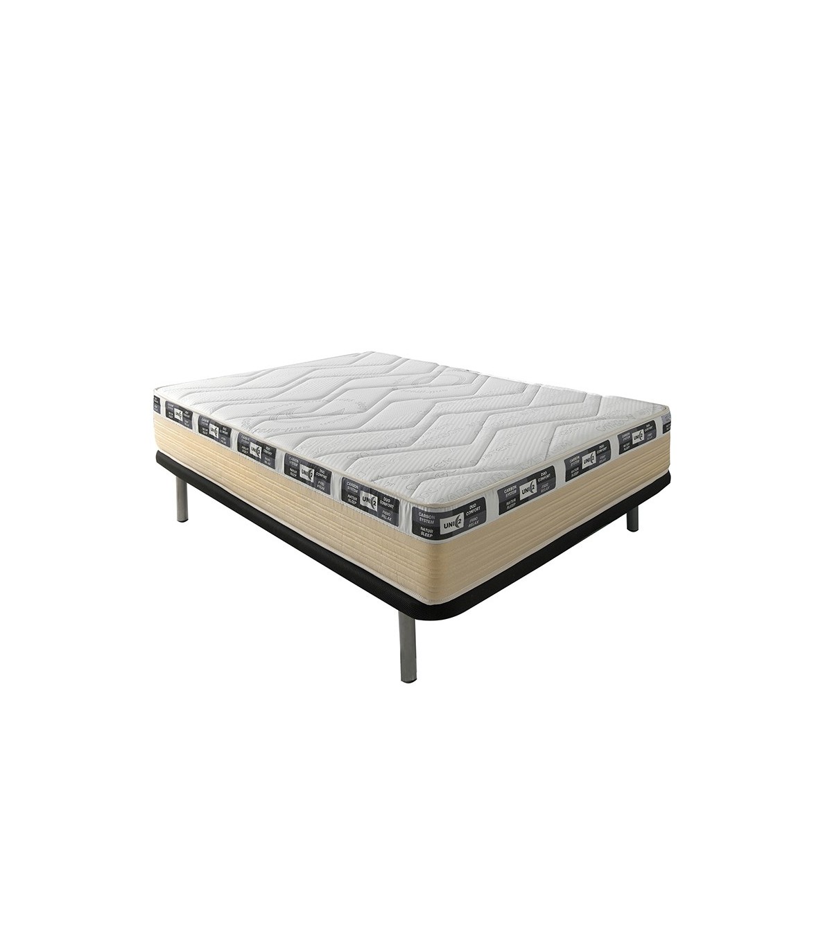• KERN: 22 cm ELIOCEL/PUR 25 kg. ZIJDE 1 : Gewatteerd met STRECH koolstofvezelstof. 3 cm visco-elastisch: + 1,5 cm ViscoGEL. + 1,5 cm Soft S.S. ZIJDE 2: Gewatteerd met 3D air stof. + Brandwerende vezel (norm UNE 23727). SLECHTE HOOGTE: 26/28 cm (+-1)